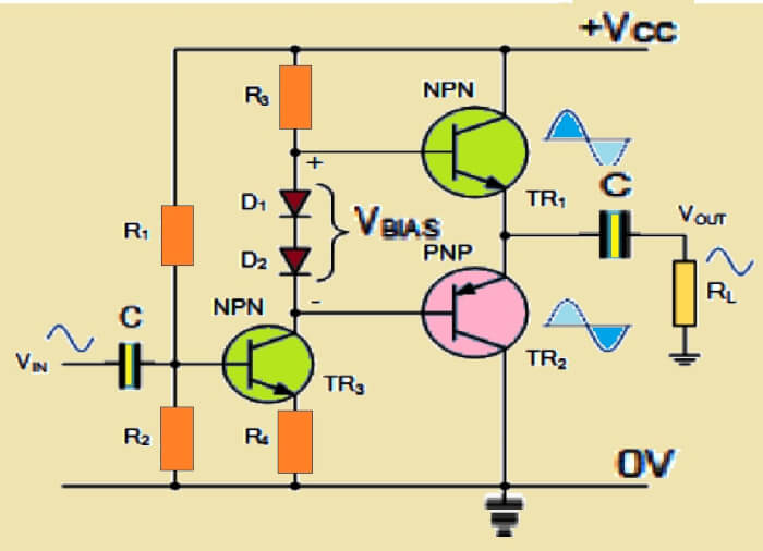 All these methods help us to push the transistor bias point just above the cut-off level so that both transistors stay slightly conducting and remove that ugly distortion.