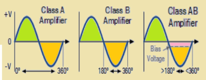 This one tries to take the best parts from both the old ones — it keeps the good efficiency of Class B and also takes the low distortion from Class A and mixes them in such a way that we get a balanced performance.